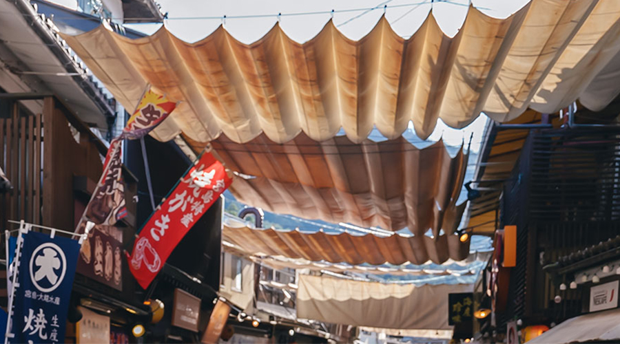 「商店街の活性化には、お互いが助け合う気持ちが欠かせません。商店街の軒に付けられている日よけもその一つなんですよ」と木村さん。各店舗へ差す直射日光を遮るためだけではなく、日よけが風を遮ることで、お客さまの暑さや寒さを和らげるように、店同士が協力し設置しているという。