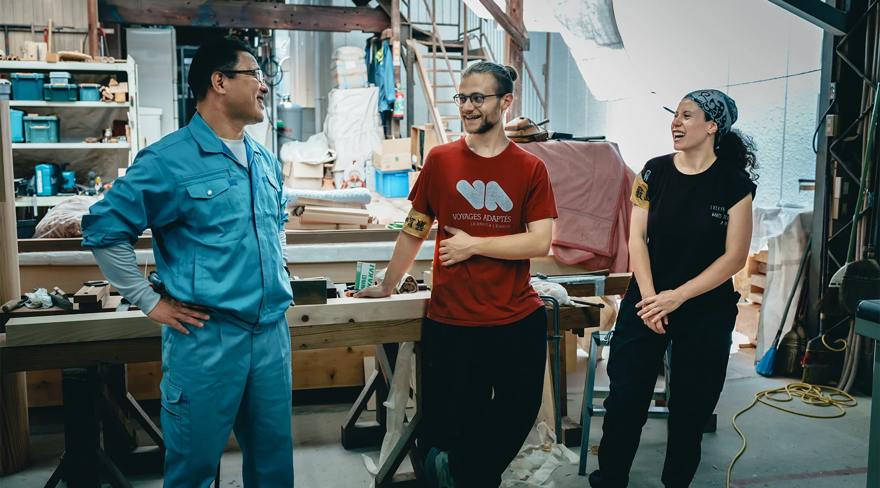 取材の日、二人はビザを利用してフランスから来日中だった。「何でも経験させてくれる三舩さんの指導は、とても分かりやすい」「フランスでは押して使う鉋(かんな)を日本では引く。工具の使い方ひとつ取っても新鮮です」と、来日にあたり1年間勉強した日本語で話してくれた。