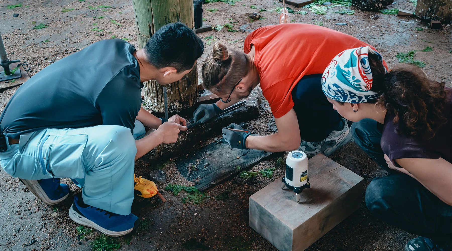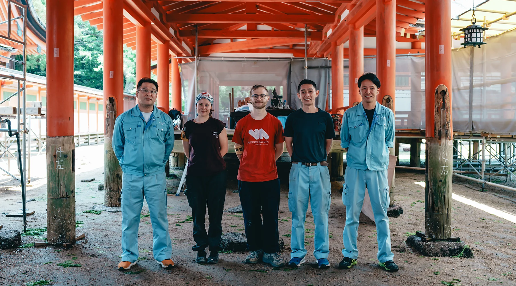 宮島に拠点を移して18年、三舩さんが寂しく思うのは「嚴島神社を維持してきた宮大工の存在、島内の工務所さえ知らない人が多いこと」だと話す。さらに、建築業界全体の人材不足にも危機感を抱く。そこで、自身が前面に出て、宮大工の仕事・魅力を発信していくことを決心。インスタグラム(@sima5rira_miyada19)を開設し、技術専門学校での出前授業などを行ううちに、海外からのインターンシップも決まった。日本建築に関心を寄せる海外の大工職人、パオロさん・ローマンさんだ。